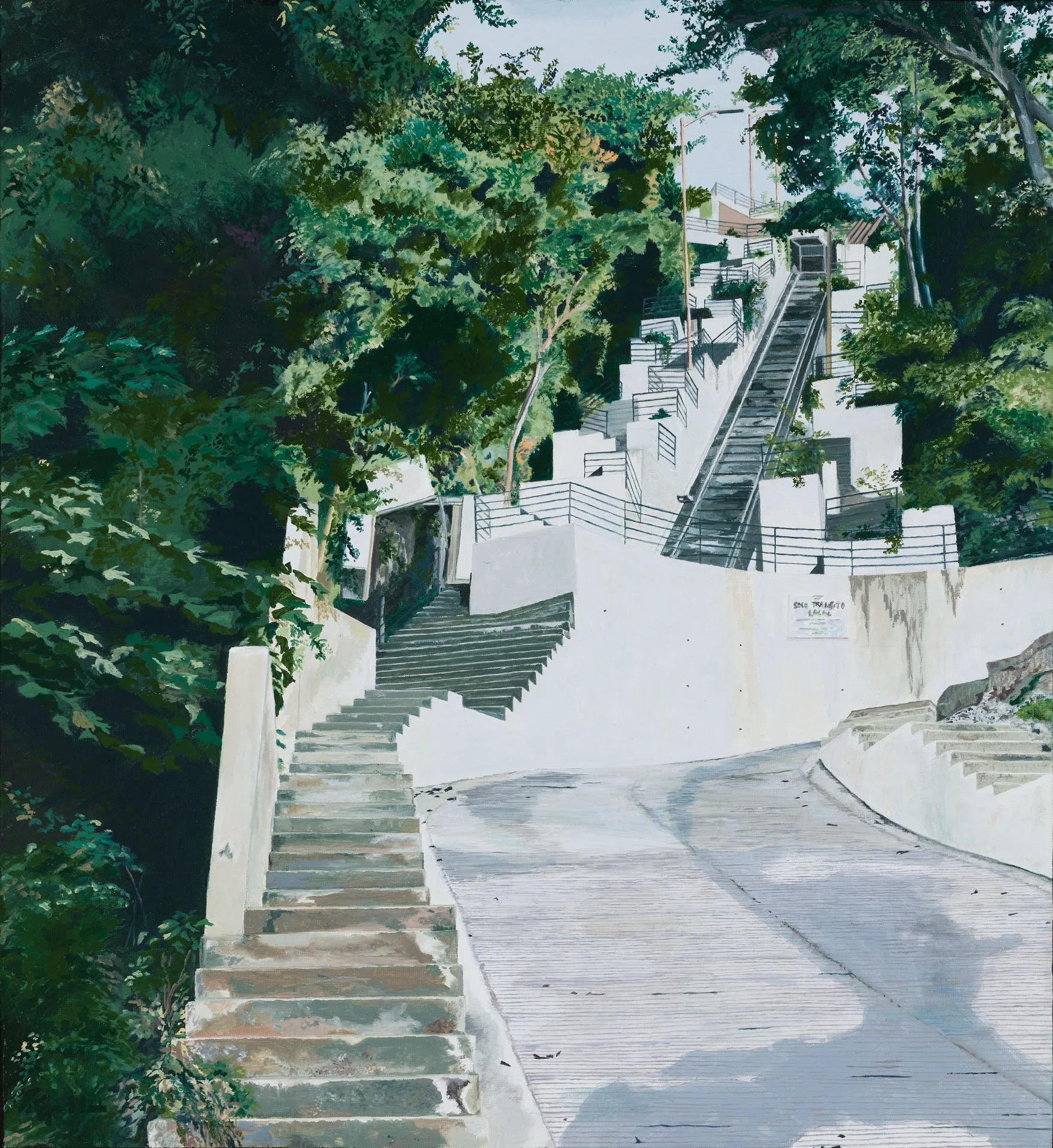 The old funicular tracks and staircases up to Mirador de la Cruz in Puerto Vallarta are a fascinating subject to create a painting for. The intense contrast between shadow and light and the dense foliage make this structure even more dramatic.